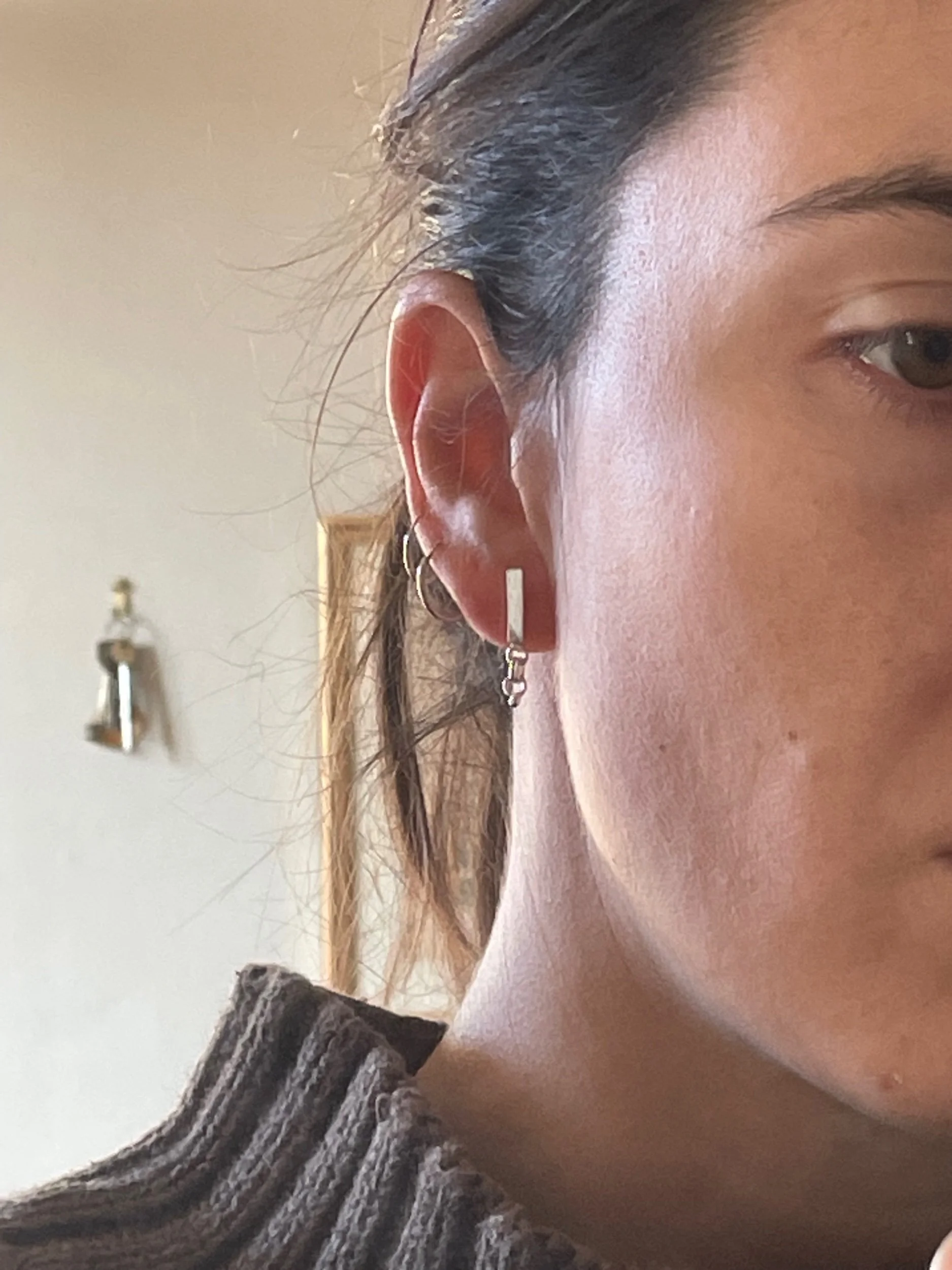 Silver stud earrings with a long section joining onto loops and bobbles that move nicely as you wear them.