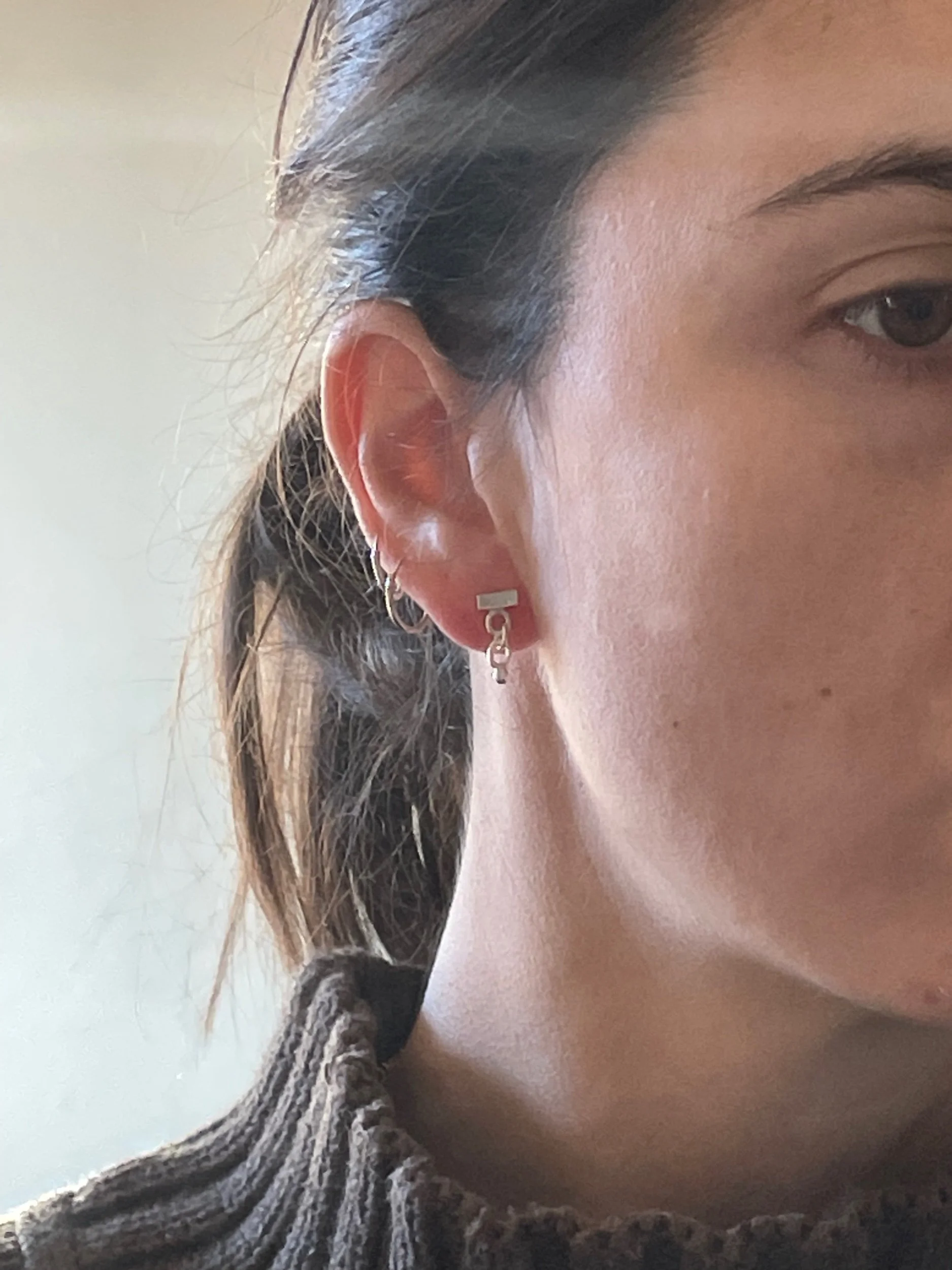 Silver stud earrings with a flat top section joining onto loops and bobbles that move nicely as you wear them.